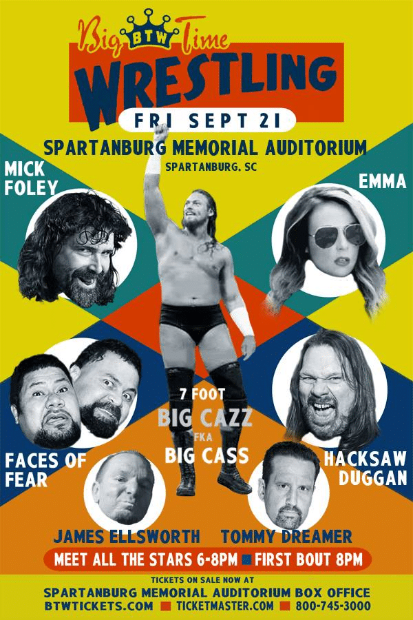 Big Time Wrestling, an independent wrestling promotion, advertised a few familiar names for an upcoming show if you’re a WWE fan. Along with Big Cass shown are James Ellsworth, ‘Hacksaw’ Jim Duggan, Mick Foley, Tommy Dreamer, and Emma.